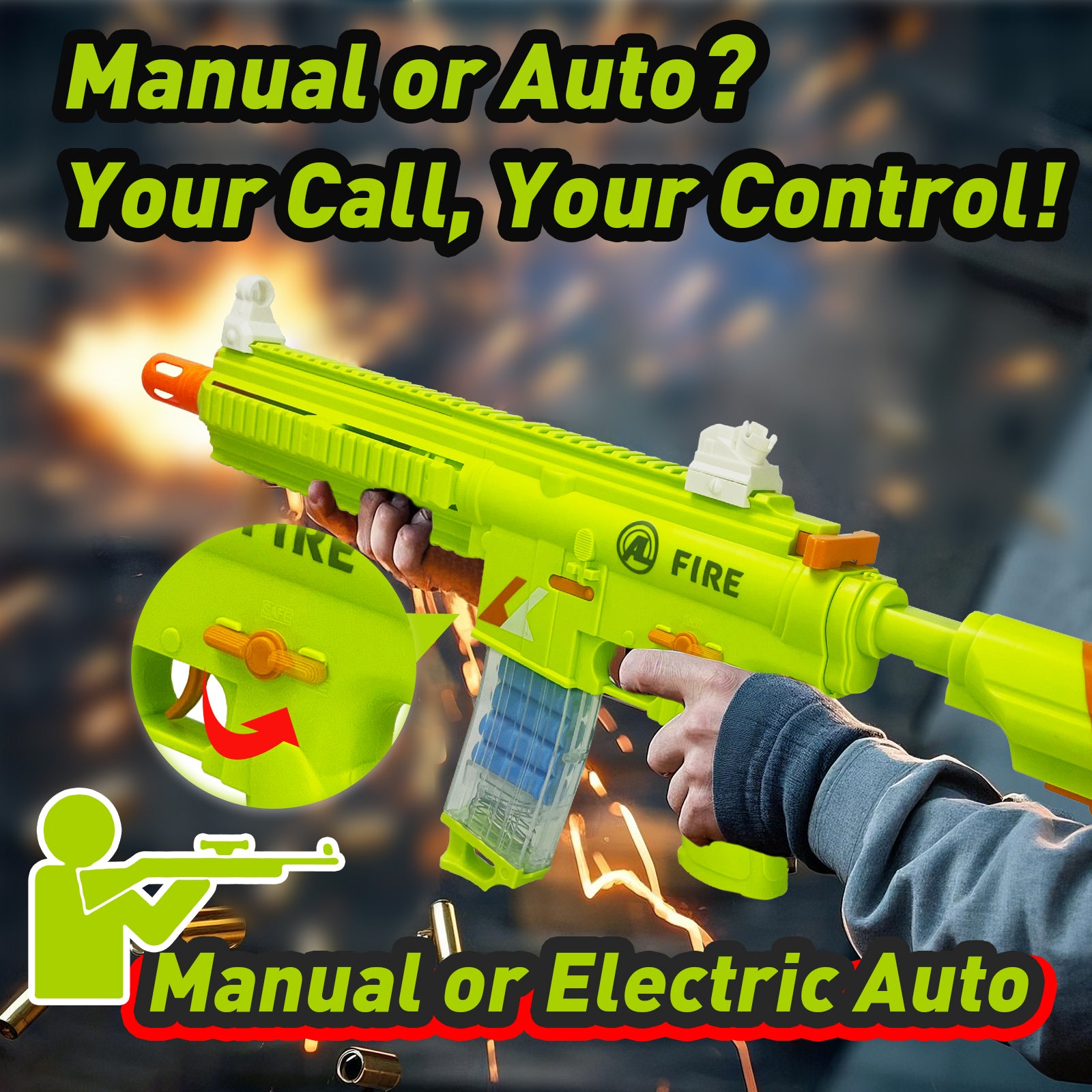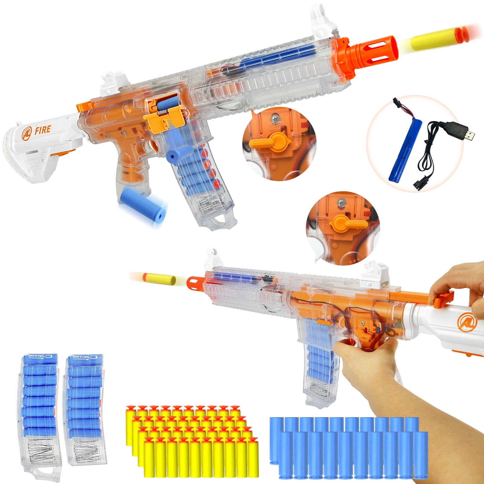 EG-013-D and EG-015-D are the high-end versions, which include a magazine loader and a 22-round large drum. - The toy gun has 2 different firing modes: manual mode and motorized mode. You can switch to the desired mode to play against the game.