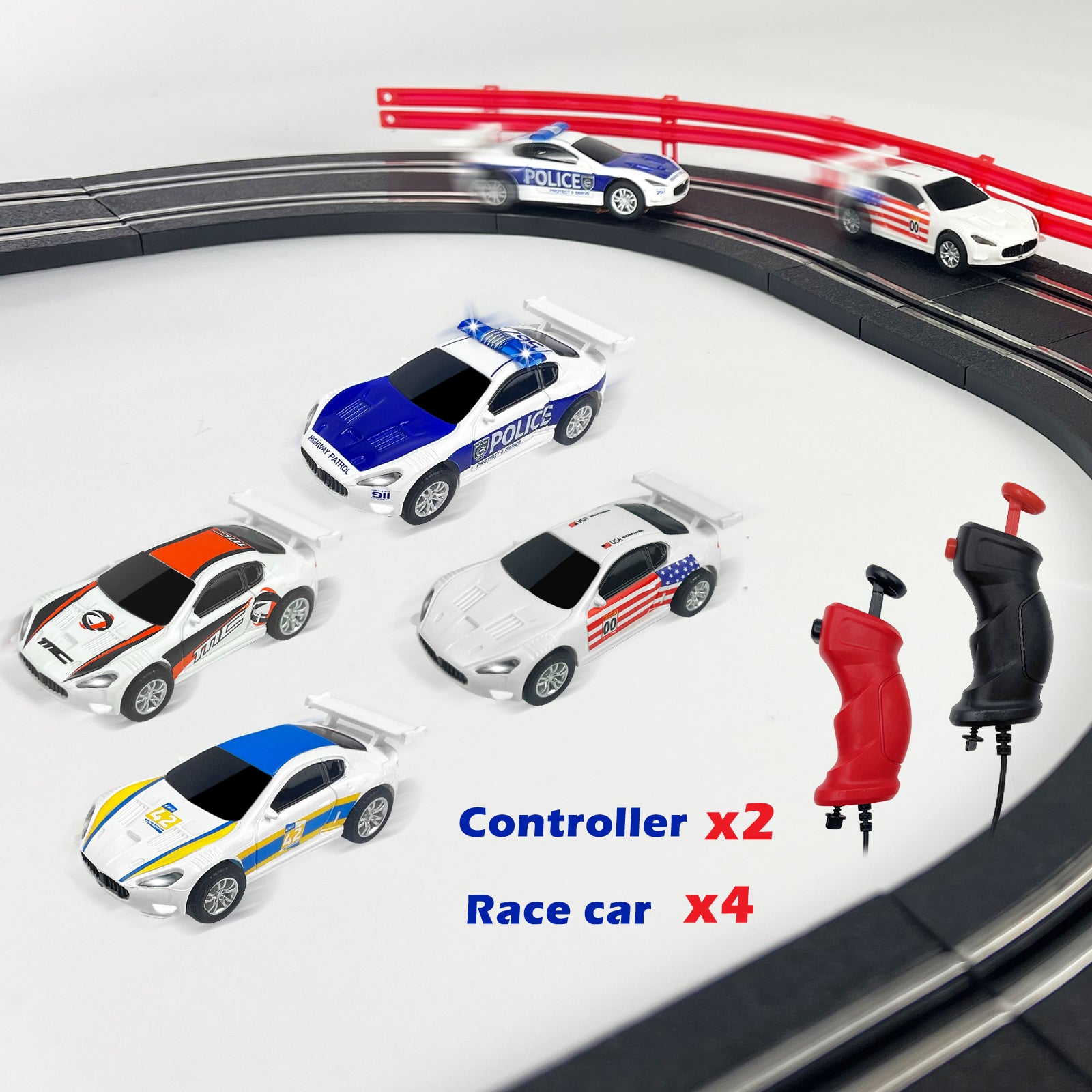 Les produits incluent : 4 modèles de voitures sous licence, contrôleur * 2, boîtier de commande * 1, garde-corps * 4, piste droite * 4, piste droite 1/4 * 2, piste courbe * 8, piste étroite * 1, piste en boucle * 16, boucle. Prise en charge *4.