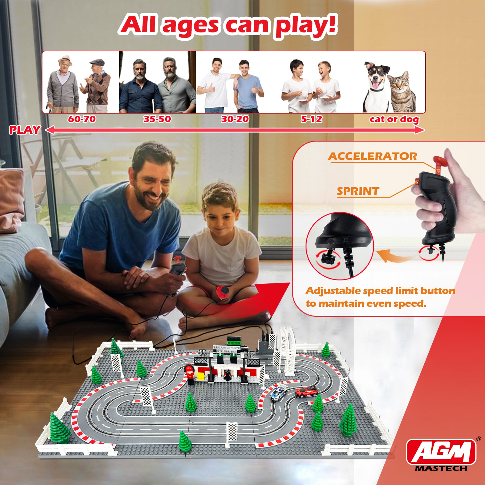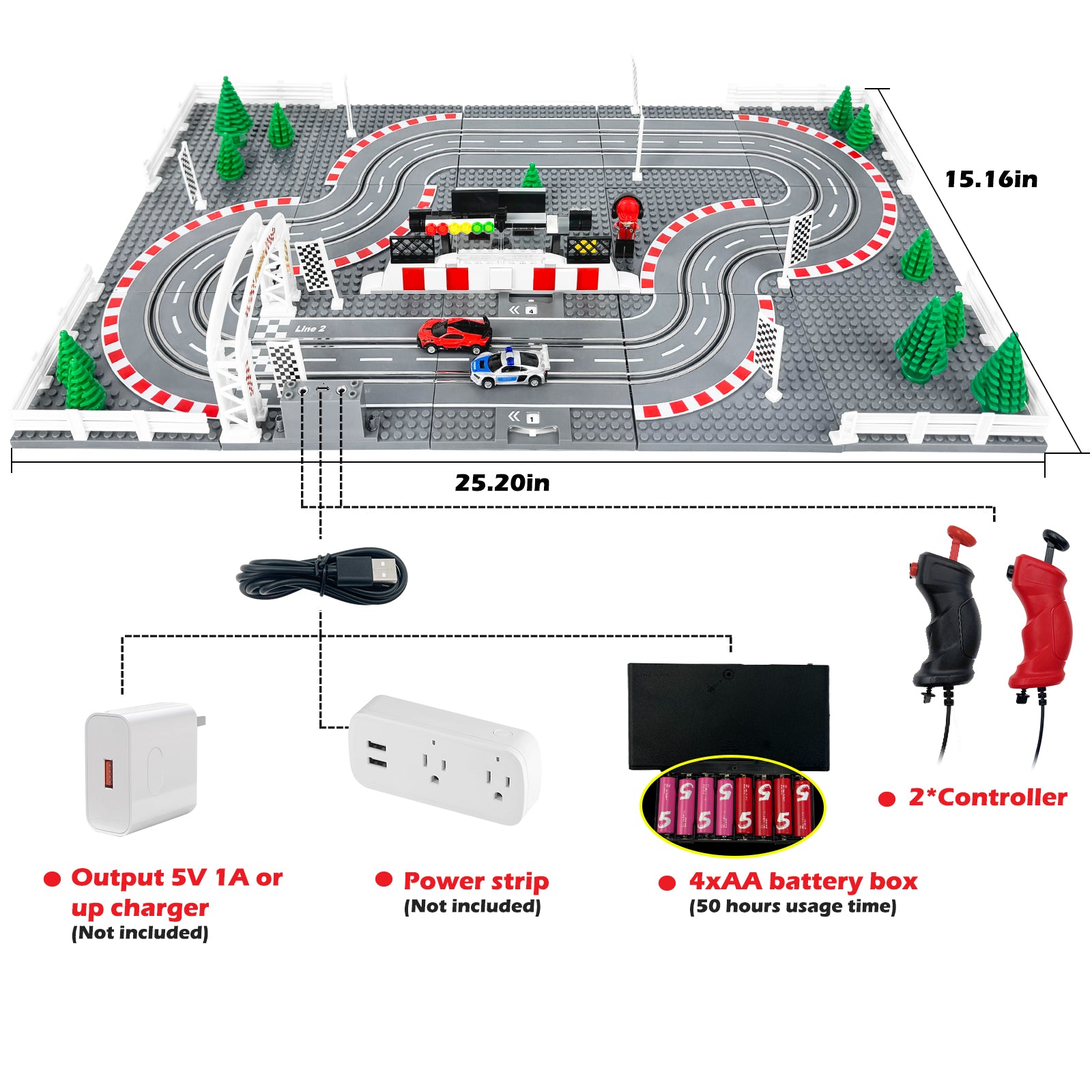 - Dual Racing Game. Two race tracks and two controllers provice duel match. Two players have fun with the slot car track. You can spend a happy playing time with your family.