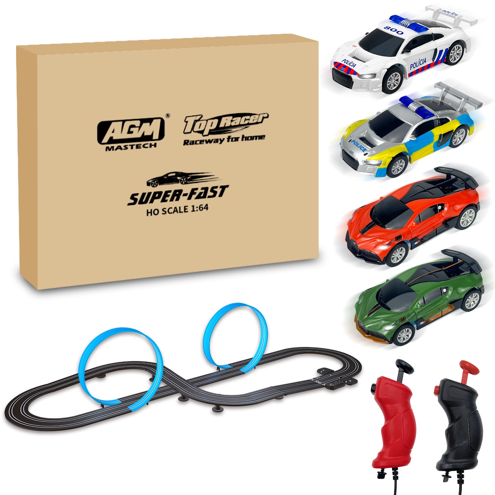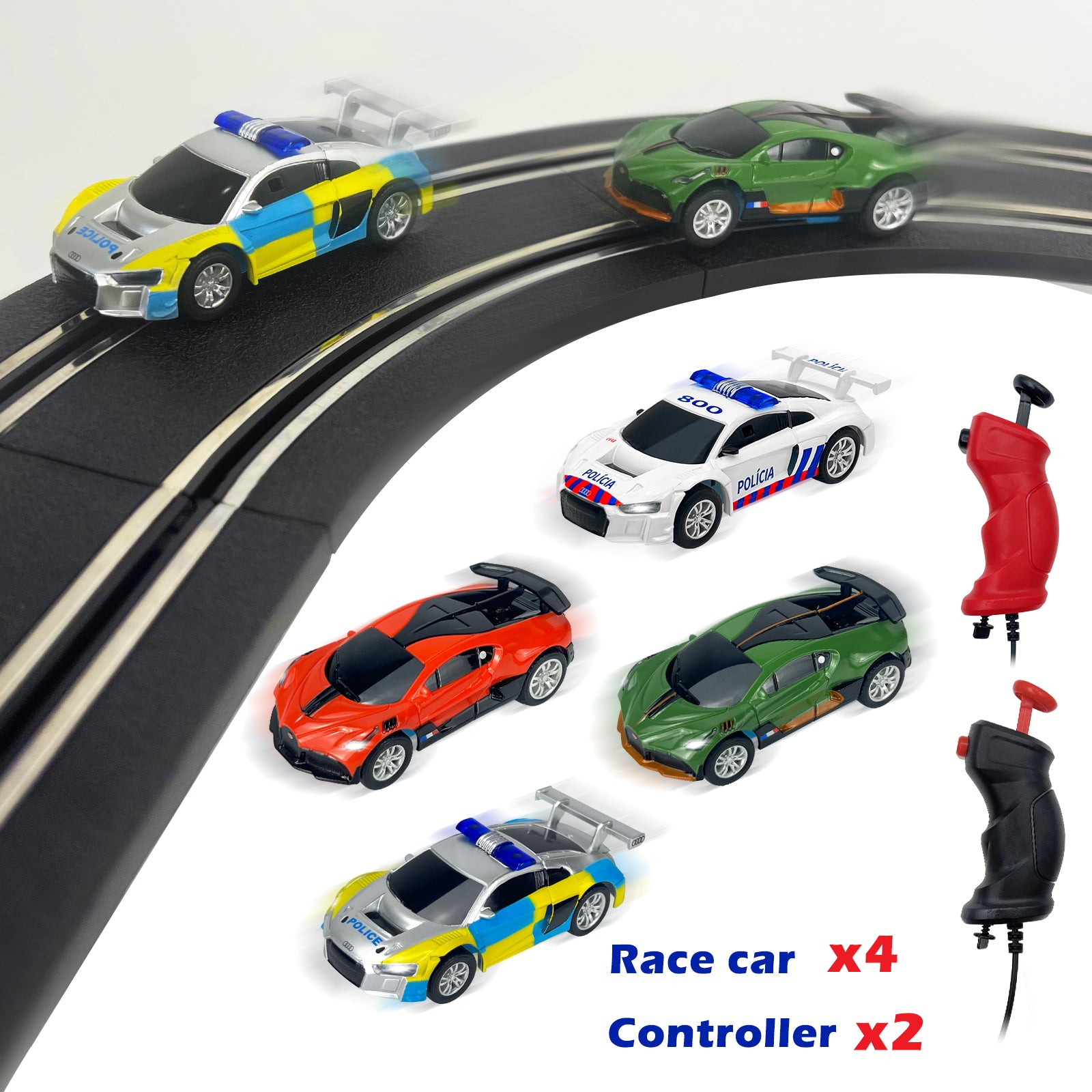 - Products include:4 licensed car models、Controller*2、Control box *1 、Straight track *10 、Curve Track*12 、Loop track*16 、Loop support *4 、1/4 Straight track *4、Track support base*5 、Column*6